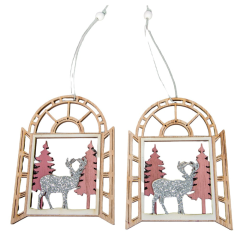 Ez az erdő mintás fa ablakdísz letisztult, mégis látványos karácsonyi kiegészítő. A nyitott ablakkeretben csillogó szarvas és fenyők jelennek meg, kellemes pasztell árnyalatokkal. A 13,5 cm-es, akasztós dekor könnyen felkerül a karácsonyfára, egy fogasra