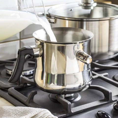 TEJFORRALÓ RM,1,5 liter AKCENT rozsdamentes acél tejforraló fazék 1,5 l, dupla falú tejforraló fedő nélkül műanyag fogantyúval, külső oldala fényes, belső oldala matt. A tejforraló oldalfalába egy vízfeltöltő szelep lett beépítve (a