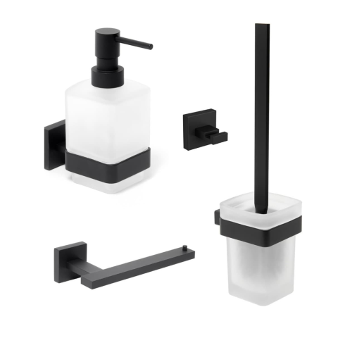 Praktikus fürdőszobai kiegészítők SAT készlet, amely a következőkből áll horog (SATDBBWAYS1), szappanadagoló (SATDBWAYS99), WC papír tartó (SATDBWAYS26), WC kefe (SATDBWAYS37)