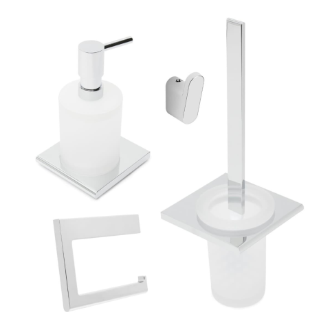 Praktikus fürdőszobai kiegészítők SAT készlet, amely a következőkből áll horog (SATDBEVOR1), szappanadagoló (SATDEVOR99), WC papír tartó (SATDEVOR26), WC kefe (SATDEVOR37)