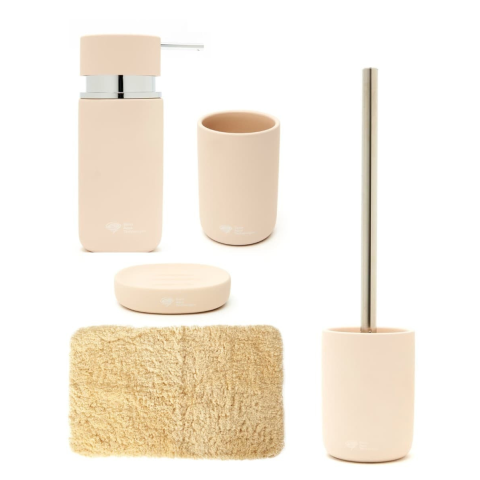 Praktikus fürdőszobai kiegészítők SAT készlet, amely a következőkből áll szappanadagoló (SATDBINFIBEPR2), kefetartó (SATDINFI27BE), szappantartó (SATDINFI39BE), WC kefe (SATDINFI37BE), fürdőszőnyeg (SATDPRED06ZL)
