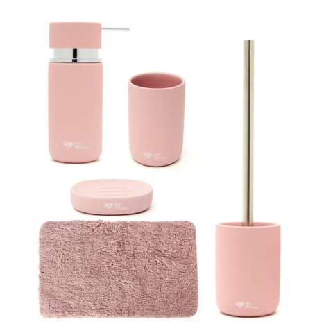 Praktikus fürdőszobai kiegészítők SAT készlet, amely a következőkből áll szappanadagoló (SATDBINFIRUPR1), kefetartó (SATDINFI27RU), szappantartó (SATDINFI39RU), WC kefe (SATDINFI37RU), fürdőszőnyeg (SATDPRED03FI)