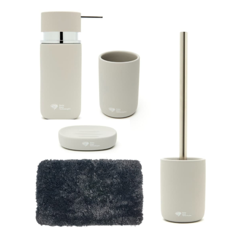 Praktikus fürdőszobai kiegészítők SAT készlet, amely a következőkből áll szappanadagoló (SATDBINFISEPR2), kefetartó (SATDINFI27SE), szappantartó (SATDINFI39SE), WC kefe (SATDINFI37SE), fürdőszőnyeg (SATDPRED01SC)