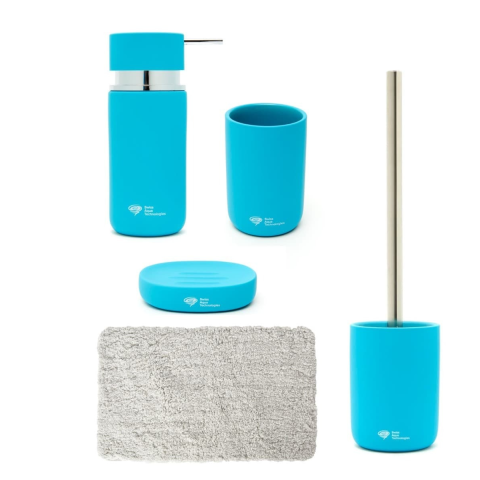 Praktikus fürdőszobai kiegészítők SAT készlet, amely a következőkből áll szappanadagoló (SATDBINFITYPR2), kefetartó (SATDINFI27TY), szappantartó (SATDINFI39TY), WC kefe (SATDINFI37TY), fürdőszőnyeg (SATDPRED05SS)