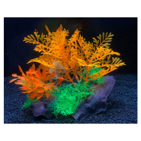 Akváriumi műnövény együttes narancssárga és zöld levelekkel. Mutatós, természetes hatású dísz. A dekorációs szerepe mellett a díszhalaknak is rejtekhelyet nyújt, ami nagyban növeli a komfortérzetüket. Élő növényekkel együtt is behelyezhető, remekül kiegészíti a látványvilágot. Megfelelő fényviszonyok között látványosan élénk színben pompázik. Talpa nehezékként szolgál, stabilan az akvárium alján tartja a műnövényt. Magassága kb. 17cm, talp szél