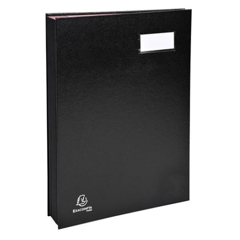 Aláírókönyv Exacompta 240x320 mm 12 részes fekete Méret: 240 × 320 mm Megjegyzés: 12 részes Szín: fekete 100%-ban újrahasznosított és újrahasznosítható alapanyagból készült aláírókönyv bővülő gerinc, pasztell rózsaszín belső lapok A/4 méretű dokumentum