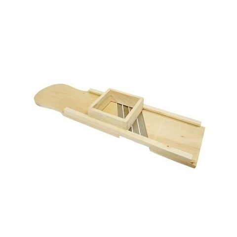 Praktikus fa zöldségszeletelő fiókkal és négy késsel, amely segítségével a zöldségeket egyenletesen és gyorsan szeletelheti.