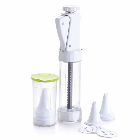 A készlet egy cukordekorálót, ezenkívül a készlet dekoratív cserélhető sablonokat tartalmaz, amelyek lehetővé teszik a sütemények, cupcakes és egyéb édességek érdekes módon történő díszítését.