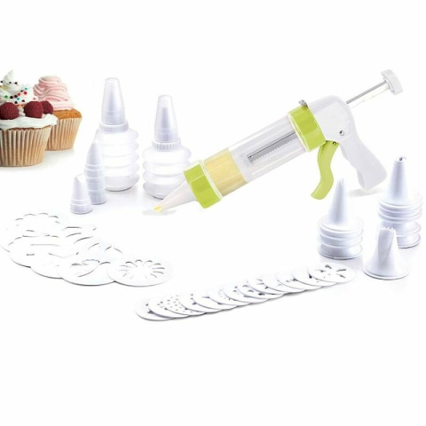 A készlet egy cukordekorálót, ezenkívül a készlet dekoratív cserélhető sablonokat tartalmaz, amelyek lehetővé teszik a sütemények, cupcakes és egyéb édességek érdekes módon történő díszítését.