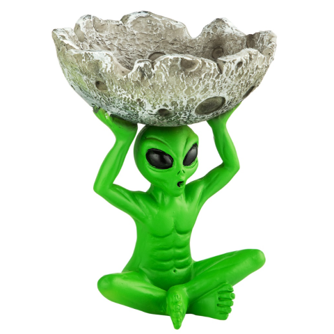 Ez a polirezinből és kerámiából készült hamutartó tökéletes alakot formáz egy ülő Alien idegen alakjában, aki egy meteorra hasonlító hamutartót tart a kezében. A kő hatású hamutartó több cigaretta részére került kialakításra. A hamutartó azonnal szemet szúr szokatlan, vidám kialakításával. Dekoratív megjelenése miatt a lakás dísze lehet. Jó minőségű hamutál, ami akár ajándéknak is tökéletes választás.