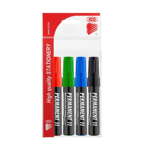 Alkoholos marker ICO Permanent 11 4 darabos Műanyag, üveg, fém, fa, illetve szinte minden felület feliratozására, jelölésére alkalmas, alkoholbázisú festékkel töltött permanent marker. Írásképe száradás után törlés- és vízálló. Kerekített csúccsal, kl