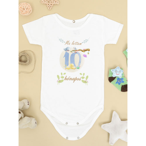 Ez a madárkás, body tökéletes választás a babád tizedik hónapjának megörökítéséhez. A Ma lettem 10 hónapos felirattal és puha pasztell színekkel díszített body 100% pamut, fehér, rövid ujjú és patentos kialakítású. Egyedi ajándék, amely fotózáshoz, meglep
