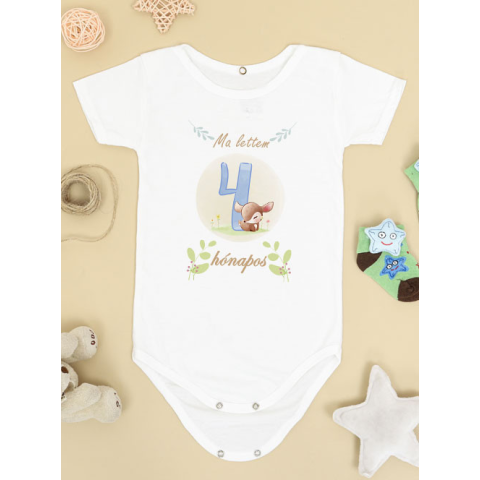 A Ma lettem 4 hónapos feliratos body egy aranyos őzikés mintával készült, puha pasztell színekben. A fehér, rövid ujjú, patentos fazon 100% pamut anyagból biztosítja a babád kényelmét. Egyedi ajándékötlet babafotózáshoz, hónapfordulóra vagy emlékbe. Kivál