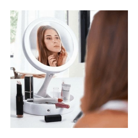 Jellemzők Kiváló minőségű kivitelezés. Állítható magasság és szög (180°). Beépített LED háttérvilágítással rendelkezik. Háttérvilágítás kapcsoló a tükrön. Praktikus kozmetikai rekeszek. Tükör méretei: átmérő: 12,5 cm alap: 15,5 x 3 cm teljes magasság: 29 cm a hajtogatott tükör mérete: 15,5 x 5 cm Működtetés: 4 x AA elem (nem tartozék) USB kábelen történő üzemeltetés (tartozék) Nagyítás: 1x, 10x Szín: Fehér Állítható sminktükör és LED l