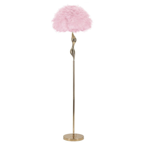 Elegáns, tolldíszítésű arany állólámpa - Tökéletes hangulatvilágítás a nappaliba ✨ Ez a stílusos állólámpa aranyszínű fémvázzal és egyedi, puha, hullámos díszítéssel rendelkezik. A különleges, rózsaszín tollból készült lámpabúra varázslatos hangulato...