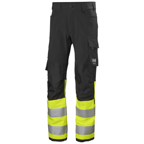 EN ISO 20471:2013: 1 YKK® cipzár Cordura® szöveterősítés AMANN cérna 4-irányban rugalmas szövet Hátul széles középső övbújtató az extra erős tartás érdekében Lépésbetét a szabad mozgás érdekében Tépőzáras oldalzseb több rekesszel Colstoktartó zseb Cordura