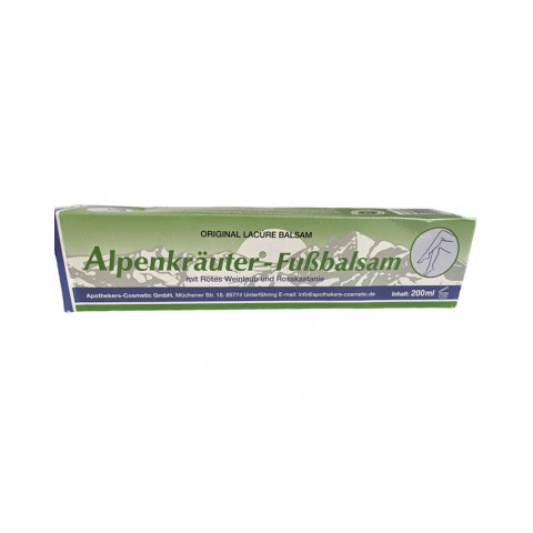 Alpesi gyógynövényeket, vadgesztenyét és vörösszőlőt tartalmazó lábbalzsam. Megszűnteti a fáradt láb érzését. Érrendszerbe hatolva fenntarthatja a láb, vénák és vérerek egészségét. Összetevők: Aqua, Alcohol, Glycerin, Propylene Glycol, Isopropyl Alco