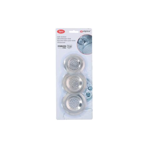 Alpina Lefolyószûrõ szett 3 db rozsdamentes 871125224902 - Egyszerû, de mégis hatékony védelem a dugulás ellen, nem csak a konyhában, hanem a fürdõszobában is. - Csak helyezd bele a lefolyóba és felfogja a nagyobb szennyezõdéseket. - Könnyen tisztítható és tartós anyagból készült.