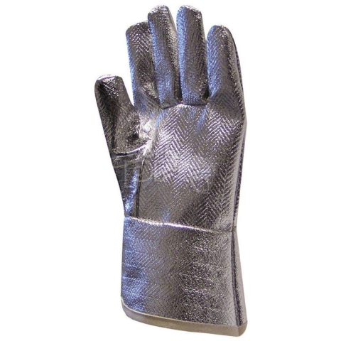 ALUMINIZÁLT KESZTYŰ 38CM *350 g/m2 vastag, hő- és vágásbiztos aramidszál aluminizált külső réteggel *véd sugárzó- (20kW/ m2 > 150 sec) és kontakt (100°C >15 sec) hőhatás, valamint közvetlen lánghatás (>7 sec) ellen *forró fémcseppek elleni védelem hege