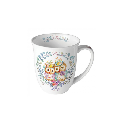 A(z) Owl couple in love porcelánbögre 0,4l egy stílusos és igényes darab porcelán anyagból készült . A termék a(z) Ambiente márka kínálatából származik , eredeti származási helye: Hollandia.