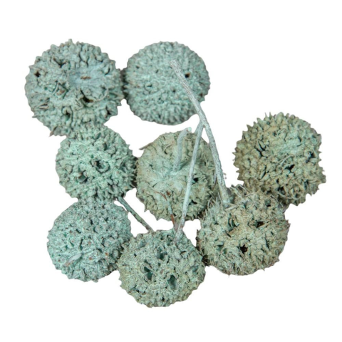 Különleges ámbrafa termések divatos aqua árnyalatban, 14 dkg-os csomagban. Egyedi, természetes dekorációs alapanyag koszorúkhoz, asztaldíszekhez és kézműves alkotásokhoz. Az ámbrafa termés aqua színben friss, modern hatást visz a természetes dekorációk