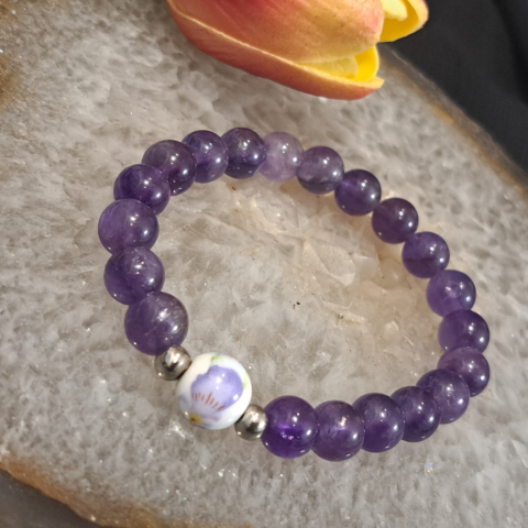 Elegancia egy csipetnyi természetességgel Kézzel készült ametiszt karkötő, középpontban egy finom, virágmintás porcelán medállal. Tökéletes választás, ha egyszerre vágysz harmóniára és stílusra. Szélesség: 0,8 cm