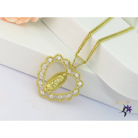 Antiallergén bőrbarát Mária medálos nyaklánc Nagy méretű szív körbe fehér cirkóna kövek díszítik ,középem Mária alak.Szin: 14KMéret: medál 40x38 mmMéret: lánc 50 cm/3mm