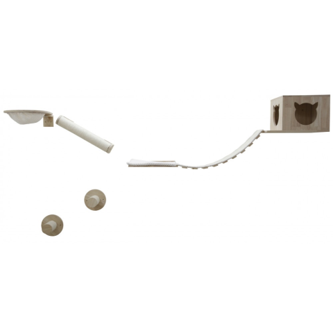 • 7-részes • 2 sisal lépcső: 15 cm, O 9 cm • fekvőfelület levehető párnával: 40 x 31 cm • rámpa sisal kötélből: 50 cm, O 9 cm • pihenő: 50 x 35 cm • sisallal borított függőhíd: 85 x 20 cm • búvóhely, belső párnával: 50 x 38 x 30 cm • anyaga tömör fa • fal