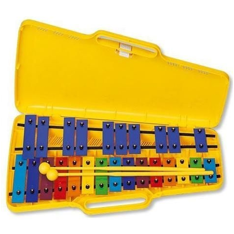 25 hangos metalofon. Műanyag tokban, kettő ütővel. Kihajtható lábakon. Tisztán csengő hang!