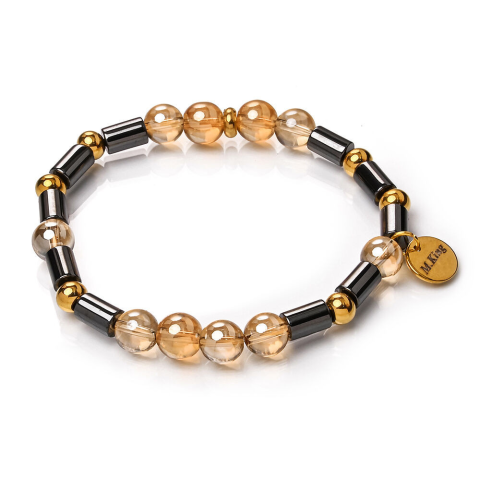 RUGALMAS KARKÖTŐ, a mérete választható.Az ékszer ásványai és tartozékai:– 8 mm-es arany angyal aura gyöngyök– 6x8 mm-es fekete hematit henger gyöngyök– Arany színű fémdíszek– M.King márkajelzésű nemesacél logóbiléta a csatn