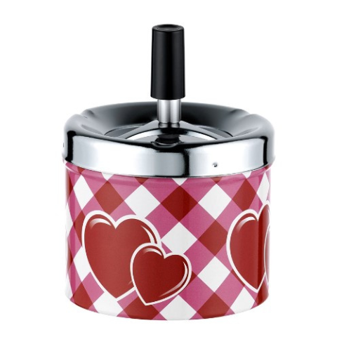 Piros és fehér színű pörgős viharhamutartó az oldalán szívecskés mintával. Magassága 12,5 cm pörgetővel együtt, az átmérője pedig 9 cm. Különleges kialakítású, ami megkönnyíti a hamu és a csikk szagmentes tárolását. Tisztítása egyszerű, csupán le kell tekerni a felső részt és máris könnyen hozzáférhető lesz a hamuzó rész.
