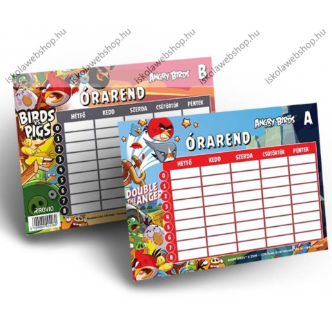 Termékjellemzők: - Kicsi méretű kétoldalas órarend, - A és B hét számára. - Mérete: 165x117 mm-es. - Angry Birds mintával.
