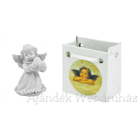 Angyal szobor, karácsonyi angyalka tasakban Anyaga: poliresin, papír Angyalka mérete: 5 x 3,2 x 2,8 cm Tasak mérete: 5 x 5 x 3 cm