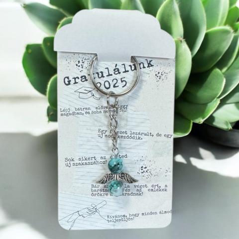Kék vagy púder színű 8mm-es üveggyöngyből készült angyalkás kulcstartó egyedi kártyával. A kártyán az év módosítható. A kártya mérete 11,5cm