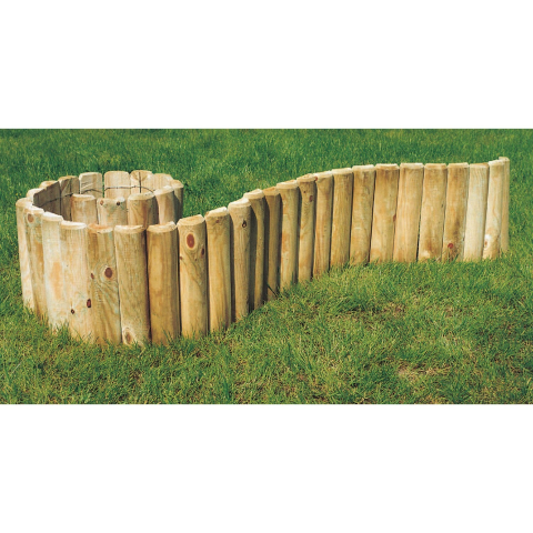 Ágyásszegély 6 cm-es, kazánnyomásos impregnálással kezelt hasított rönkfa darabokból készül, amelyek egy 6 cm x 30 cm x 200 cm méretű, feltekerhető elemmé kerülnek összeszegelésre.
