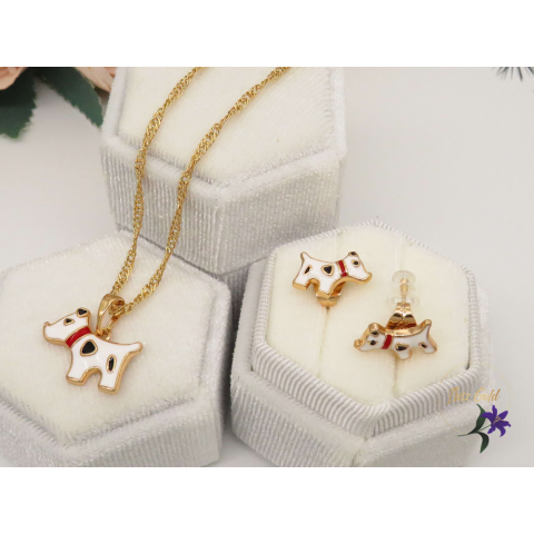 Gold Filled kutyusos szett tűzzománc díszítéssel Szin: 18K Méret: lánc 35 cm /1,5mm Medál: 15x20mm Fülbevaló: 13x5mm Bedugós .szár 9mm