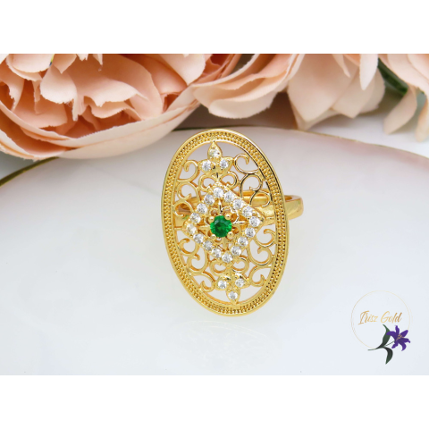 Gold Filled ovals alakú cskpemintázatú gyűrű középen kis zöld kővel Szin: 24K Méret: 28x20mmÁllitható méret: 52-62-ig