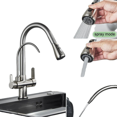 1 kép Antik konyhai csaptelep, húzza ki a kialakítást, kettős fogantyú, szálcsiszolt nikkel