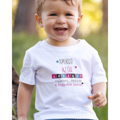 Anyák napi gyerek póló, nekem legjobb anya jutott. Amikor az Úr anyákat osztott, nekem a legjobb jutott, egy különleges gyerek póló, meglepetés egy különleges édesanyáknak. Szuper ajándék ötlet születésnapra, karácsonyra is, ha ezt viseli egy Édesanya gye