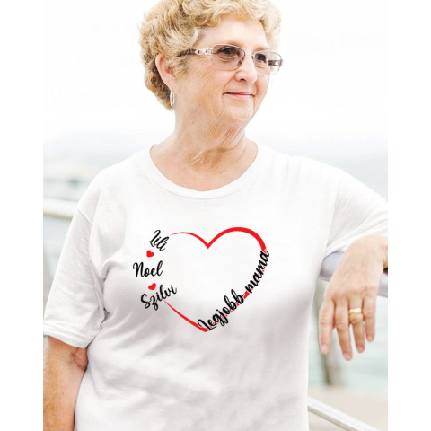 Anyák napi ajándék, női póló unokák nevével. Egy szívhez szóló, személyre szabható gyerekneves női póló a legjobb Nagymamának születésnapra, névnapra, anyák napjára. Mama és unokái karcsúsított póló többféle méretben és színben. Kiváló minőségű férfi é
