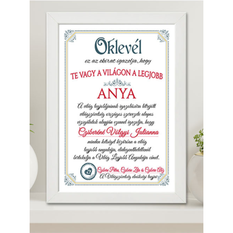 Anyák napi oklevél, A3 falikép édesanyáknak, ami egy Oklevelet tartalmaz a Világ legjobb anyukájának. Köszöntsd édesanyádat anyák napján, születésnapján, vagy karácsonykor egy névre szóló okirattal. A képkeret színe és a szöveg háttere fehér. Falra akasz