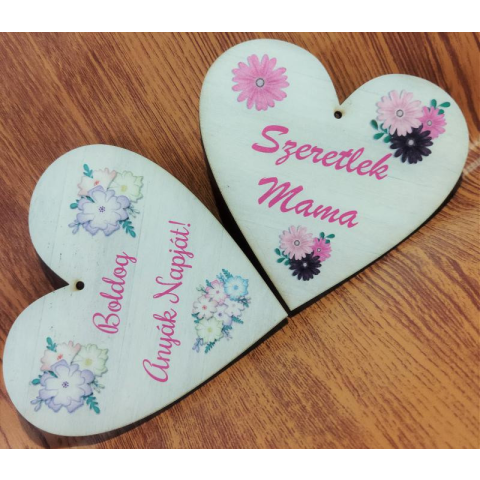 Fából készült szív alakú ajándék. UV nyomtatással készült mintával, tetején lyuk,mellyel felfüggeszthető szép színes szalaggal. Mérete: 11,5 x 11 cm kb. Anyák napjára lézerrel vágott fa szív, színes UV nyomtatással. A gravírozásban és az UV nyomta