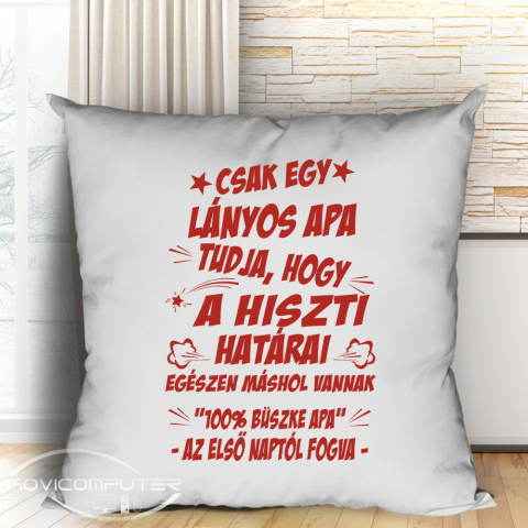 Vicces ajándék apának, lányos apukák párna. Csak egy lányos apa tudja, hogy a hiszti határai egészen máshol vannak, 100% büszke apa az első naptól fogva, ha ismersz apukát akire illik ez a leírás ne habozz, rendelj neki egy ilyen párnát, a nevetés garantá