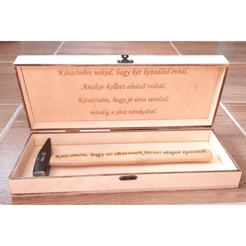 A szülőköszöntő kalapács esküvőre tervezett, személyre szabható ajándék művészien ötvözi a praktikumot és az emlék értékét.A simára csiszolt fa nyél és a strapabíró acélfej elegáns kontrasztját lézergravírozott névvel, dátummal vagy ünnepi üzenettel tehet