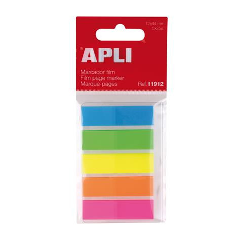 Jelölőcímke, műanyag, 5x25 lap, 12x45 mm, APLI, 5 szín az öntapadó jelölőcímkék megkönnyítik munkáját, segítségükkel különböző színkódokkal jelölheti a fontos információkat írható PP anyag 5 színben: kék, zöld, sárga, narancs, rózsaszín Gyártó/első EU