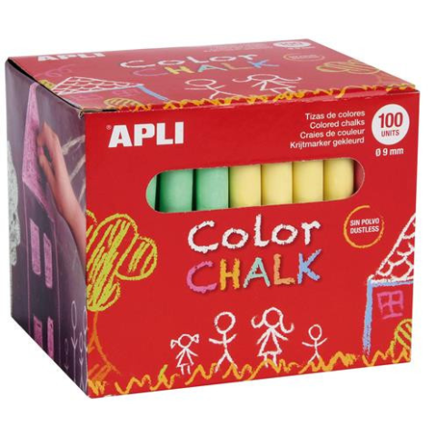 Táblakréta, kerek, 100 darabos, APLI, vegyes színek táblakréta pormentes ideális rajzoláshoz krétás táblára, fára, aszfaltra tökéletesen fedő, élénk színek kerek test könnyű fogás a készlet 100 db krétát tartalmaz 6 különböző szín: sárga, zöld, piros,