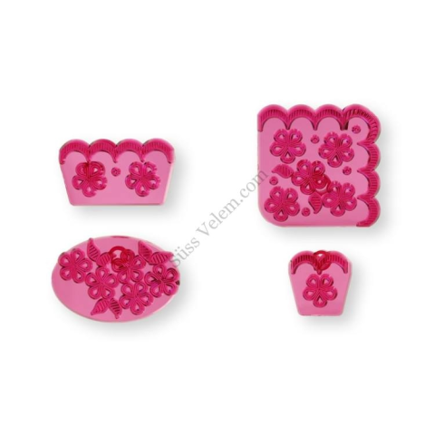 Dobd fel tortáidat szebbnél-szebb saját készítésű marcipán vagy fondant díszekkel. Ezzel az Apró virágok szegélyminta készítő sziluett kiszúró készlettel gyerekjáték lesz a tortadíszítés. A készlettel gyönyörű szegélyeket készíthetsz, amik nagyon jól fognak mutatni az alkalmi, szülinapi vagy esküvői tortákon. A szettben 4 féle virágos szegély dísz készítőt találsz: négyzet alakú cakkos szélű virágos (7*7 cm, a virágok mérete: 1,5-2 cm) ovális fo