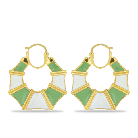Aranyozott Ezüst Fülbevaló - Zöld-Fehér Tűzzománc mintával ✨ Elegáns és modern, aranyozott ezüst fülbevaló, gyönyörű zöld és fehér tűzzománc mintával. Tökéletes választás mindennapi viseletre, de különleges alkalmakra is. Jellemzők: Arannyal bevont...