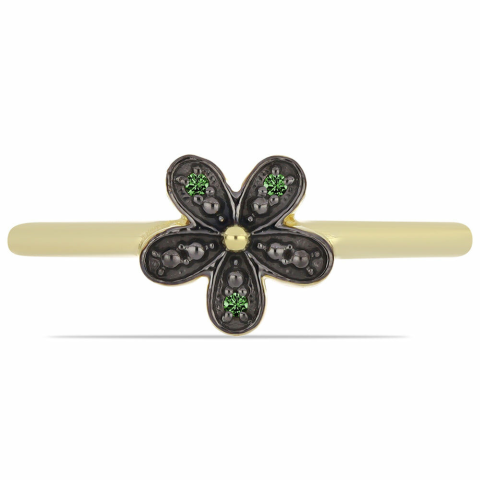 Virágos Aranyozott Ezüst Gyűrű Zöld Gyémántokkal 💍 Ez az elegáns, arannyal bevont ezüst gyűrű egyedi virág dizájnnal és apró zöld gyémántokkal díszítve készült. Tökéletes választás azok számára, akik egy különleges és kifinomult ékszert keresnek. Főb...