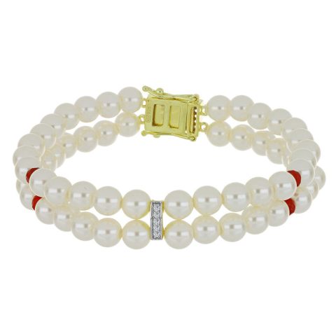 1 kép Arannyal Bevont Ezüst Karkötő Fehér Édesvízi Tenyésztett Gyönggyel és Madagaszkári Rubinnal, Y59239